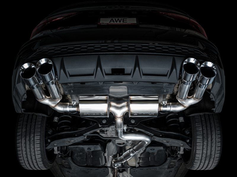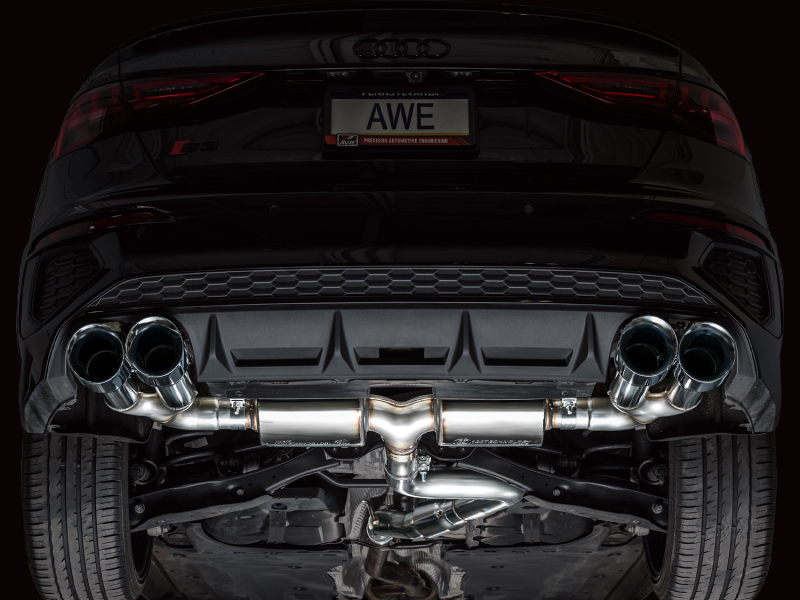 Introducing the first AWE Exhaust for the Audi S3 to ever feature patented drone-canceling 180 Technology®. The Touring Edition features a 3” inlet complete with an adapter to accommodate the factory downpipe perfectly while leaving an open 3” connection. In the rear resides AWE’s patented 180 Technology® resonators responsible for maintaining straight-through performance while decimating drone-prone frequencies. Thanks to the design and construction of 180 Technology® resonators, the internals will not break down and degrade over time causing tone change. Just full-bodied, drone-free rumble for life from the point of installation. This configuration provides the best ratio of interior refinement and exterior rumble on the market. No valves needed. Switch driving modes and the exhaust will render the same result as a vavled exhaust. It's the do-it-all exhaust for every day drivers. Comes complete with quad 4.5" slash-cut, double-walled tips in chrome silver. The AWE Touring Edition for the 8Y S3 is made in the USA and backed by AWE’s Fitment Guarantee, 50 state emissions compliance, No Check Engine Light Guarantee, and the AWE Lifetime Warranty.. Features a slip-fit inlet adapter for perfect factory downpipe fitment while leaving an open 3” connection. The first ever AWE Exhaust Suite for an Audi S3 to feature patented drone-canceling 180 Technology®. Handcrafted from CNC mandrel-bent 3" and 2.5" U.S.-sourced .065” wall T304L stainless steel. Available as the sophisticated, drone-free Touring Edition or aggressive Track Edition. Quad 4.5” double-walled slash-cut tips available in chrome silver or diamond black. Conversion kits make it easy to swap between editions so you always have options. Less is more: clean, straight-through design maximizes performance. AWE 22-24 Audi 8Y S3 Touring Edition Exhaust - Chrome Silver Tips. Individually adjustable tip outlets for the ease of installation. Dyno-verified gains of +7 whp & +2 lb-ft of torque at the wheels. AWE Touring Edition Exhaust for Audi 8Y S3 - Chrome Silver Tips. Direct bolt-on for factory-like simplicity. AWE Perfect Fitment Guarantee. Manufactured in-house at AWE. AWE Lifetime Warranty. AWE No CEL Guarantee. Touring Catback