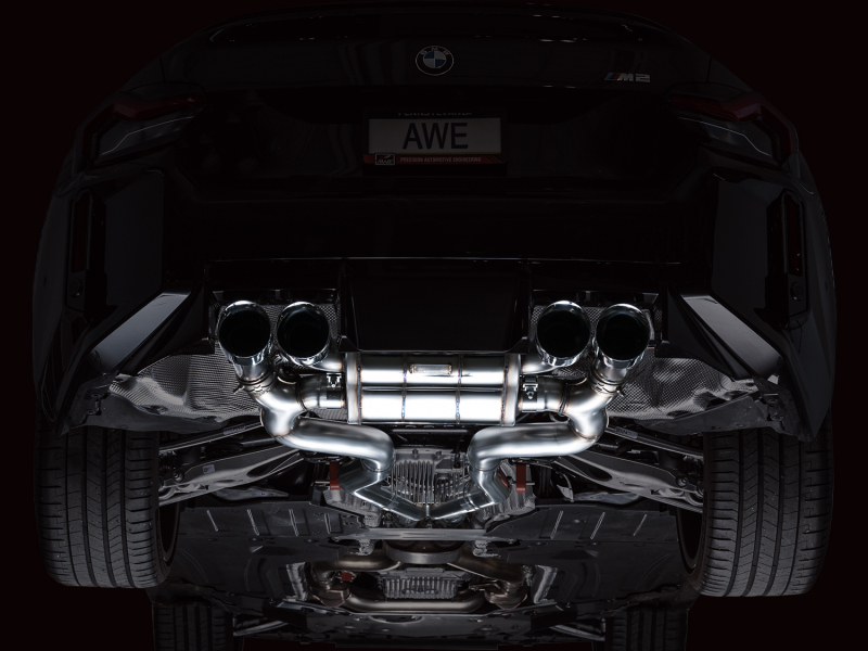 The AWE SwitchPath™ Exhaust is comprised of 3-inch U.S.-sourced T304L stainless steel, a precision x-pipe, and a valved SwitchPath™ muffler tuned for the S58. Beginning after the factory mid pipe, the precision X-pipe immediately cures the S58 of its rasp, deepening the tone before it's refined further by the bespoke SwitchPath™ muffler. When the valves are closed, the SwitchPath™ produces a refined, aggressive howl while remaining full-bodied and powerful – no congested, metallic sounds when you're on it. At cruising, interior acoustics are close to stock with no drone. AWE SwitchPath™ tech responds perfectly to the many transmission settings and shift points of the G87. Drop the hammer with the valves closed and SwitchPath™ sings a proper M anthem. If you were to leave the valves closed at all times after equipping SwitchPath™, we wouldn’t blame you — it’s that good… all of the time. Open the valves and the S58’s roar is uncorked. Sport and Sport+ modes achieve the ultimate contrast in behavior when compared to comfort driving modes (aka valves closed). In Sport mode, the exhaust note is powerful, clean, and aggressive. In Sport+ mode, the same aggression applies… but with grin-provoking burbles. Thanks to the precision X-pipe, the rasp is still kept in check while allowing the exhaust note to reach full aggression. The AWE SwitchPath™ comes with quad 4.5” double-walled, slash-cut tips available in chrome silver or diamond black. The exhaust also features inlet adapters to mate to the factory mid-section. When pairing AWE Mid-Pipes to the SwitchPath™ or Track Edition Exhausts, these adapters are not needed. Due to varying cut points, AWE Exhausts are not guaranteed to mate with another manufacturer’s mid pipes. AWE's No CEL Guarantee, Perfect Fitment Guarantee, and Lifetime Warranty come standard.. SwitchPath™ incorporates AWE’s drone-canceling 180 Technology®, and retains all factory valve controls – no additional remote needed. Quad 4.5” double-walled, slash-cut tips available in chrome silver and diamond black. AWE Tuning 23-24 BMW G87 M2 SwitchPath Edition Exhaust - Chrome Silver Tips. Less is more: clean, straight-through design maximizes performance. Optional non-resonated performance mid-pipes available separately. AWE SwitchPath™ Exhaust for BMW G87 M2 - Chrome Silver Tips. AWE SwitchPath™ Exhaust for BMW G87 M2 - Chrome Silver Tips. 50-state emissions-complaint dual 3” exhaust configuration. Max gains of 3 hp and 4 lb-ft of torque at the wheels. Bespoke X-pipe unlocks a smooth tone out of the S58. Ball socket mounting points for easy installation. AWE Perfect Fitment Guarantee. Manufactured in-house at AWE. AWE Lifetime Warranty. SwitchPath™ Catback. AWE No CEL Guarantee