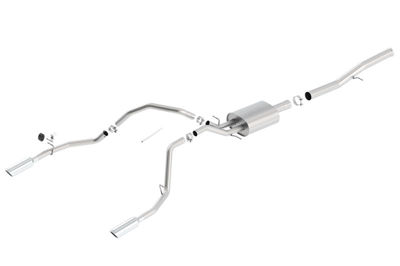 This 3.5" diameter into dual 2.25" Cat-Back™ system delivers the classic S-Type sound with no drone inside the vehicle. The system features single 4" round bright chrome on T-304 stainless steel tips on each tail pipe. A system with black chrome on T-304 stainless steel tips is also available. BORLA® Cat-Back™ & Axle-Back exhaust systems feature patented straight-through and multi-core technology designed to unleash hidden horsepower. Increased exhaust velocity adds power, driving excitement, fuel economy, and the distinctive BORLA® Sound of Power respected by motoring enthusiasts everywhere. Each system is built from premium T-304 stainless steel, superior to T-400 series knockoffs (such as 409), to give you the absolute best in performance and durability. Ultra-smooth mandrel bends ensure maximum flow & power, and precision computer numerical control (CNC) manufacturing ensures an accurate fit. Best of all, BORLA® stands behind every system with a Million-Mile Warranty. Just what you'd expect from the world's most experienced (and most winning) exhaust brand.. Borla Cat-Back and Rear Section exhaust systems feature patented straight through and multi-core technology to unleash hidden horsepower. Increased exhaust velocity adds power; driving excitement; fuel economy; and the distinctive Borla Sound of power respected enthusiasts everywhere. Each system is built from premium 300 series austenitic stainless steel; superior to T-400 series knockoffs; to give you the absolute best in performance and durability. Ultra smooth mandrel bends ensure maximum flow and power; and precision computer controlled CNC manufacturing ensures an accurate fit. Best of all Borla stands behind every system with a Million-Mile Warranty. Just what you would expect from the worlds most experienced and most winning exhaust brad.. S-Type Cat-Back Exhaust System 2014-2018 Chevrolet Silverado 1500/ GMC Sierra 1500 6.2L V8 Automatic/ Manual Transmission 2 & 4WD Extended Cab With Standard Bed (6' 7") 143.5" Wheelbase/ Crew Cab Short Bed (5' 9") 143.5" Wheelbase.. 2014-2018 Chevrolet Silverado 1500/ GMC Sierra 1500 6.2L V8 Automatic/ Manual Transmission 2 & 4 Wheel Drive Extended Cab With Standard Bed (6' 7") 143.5" Wheelbase/ Crew Cab With Short Bed (5' 9") 143.5" Wheelbase.. Borla 14 Silv/Sierra 1500 EC Std/CC Short 143.5in WB S-Type Single Split Rear Exit Cat-Back Exhaust. Cat-Back Exhaust System - S-Type. S-Type; Cat-Backâ„¢ System. Million Mile Warranty. Borla Cat-Back System. Exhaust System Kit. Cat-Back System. ExhstSysKt