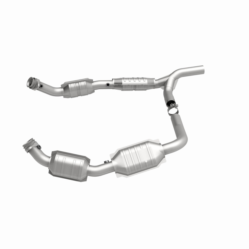 MagnaFlow's direct-fit converter uses precision design and manufacturing to match OEM fit and flow characteristics. The converter is constructed from stainless steel with mandrel-bent tubing to reduce flow restrictions and resist corrosion. Hardware and gaskets are included for a straightforward installation with common tools—no cutting or welding required for most installs. The part was developed using metrology techniques to replicate factory geometry and interchanges with OE numbers such as 7C2Z-5F250-B and 8C2Z-5F250-A. It is designed to meet Federal (EPA) emissions requirements for OBDII federally registered vehicles; check local regulations for states with separate emissions standards.