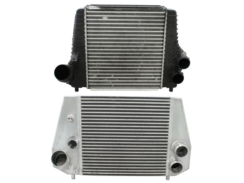 Bladerunner Intercoolers represent the next generation of intercoolers. The Bladerunner intercoolers utilize a 3 in. bar and plate design that out performs OE style tube and fin core designs. The end tanks are constructed out of 3/16 in. TIG welded aluminum plate tanks that incorporate three multi-directional vanes that efficiently direct air flow through the entire core for maximum cooling. The Bladerunner intercooler also comes with 4 1/8 in. pre-tapped ports for easy gauge installation as well as other auxiliary input options. Tested at 200psi which is perfect for the high boost applications. In recent testing the Bladerunner intercooler produced a 200 deg. temperature drop and a 100 deg. EGT drop as well as increasing air flow by 30 percent. Dont waste your time and money on modified factory intercooler. Invest in the aFe Bladerunner intercooler. the most sophisticated intercooler design on the planet.. aFe Power BladeRunner 3in Intercooler 13-14 Ford F-150 V6 3.5L (tt). BladeRunner GT Series Intercooler Ford F-150 13-14 V6-3.5L (tt). Reduce Potential For Future Engine Damage Due To Cooler Failure. Does Not Defeat Any Intended Emission Control Device/System. All New Construction; Not A Repaired/Refurbished Unit. Improved Direct-Flow Design Prevents Failures. Increased Reliability Over The OE Unit. All Connections Are Welded Not Brazed. Will Not Cause A Check Engine Light. BladeRunner GT Series Intercooler. No Core Charge/No Exchange Charge. All Stainless Steel Construction. Limited Parts Only Warranty. Aluminum Intercooler. Direct Replacement. Pressure Tested