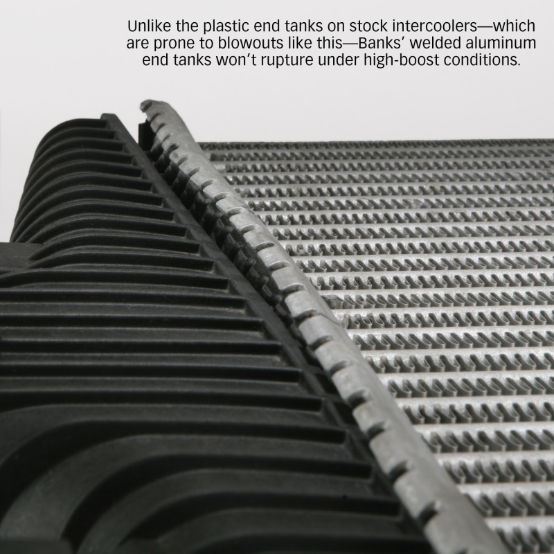 Eliminates restrictions, dramatically increasing the cooling capacity for massive continuous power. Big aluminum end tanks won't burst like stock, with a thicker core for a 21% improvement in volume. Includes mandrel-bent 3.5 inch high-flow boost tubes and super-flow High-Ram intake manifold for maximum performance. Superior to Stock: Everything about Banks Techni-Cooler Intercooler System is designed bigger and better. This upgrade kit includes a set of 3.5 inch high-flow boost tubes and a Banks designed intercooler solution. The Banks Boost Tubes feature over sized mandrel-bent pipes matched to the increased performance design of the new intercooler. The Banks designed intercooler has a 19 percent thicker core with 21 percent greater volume to improve cooling. It also has large high-efficiency all-aluminum end tanks and wide-open inlet / outlets for a 69 percent greater flow area. Lastly to complete the kit, our Banks High-Ram Intake Elbow is also included. The Banks Techni-Cooler dramatically increases the engines cooling capacity and power potential by balancing a richer fuel mixture with cooler, denser, improved airflow. Result: You get higher continuous power and more power at any exhaust gas temp (EGT), with better fuel economy, and lower EGTs. That's a truckload of benefits! It doesn't get any cooler than Techni-Cooler! Mounting hardware included. Key Features: High-efficiency custom-machined durable cast end tanks. Steady power output even under extreme temperatures. Improves Power, Durability and Fuel Economy. 3.5in Boost Tubes Reduces boost pressure loss. Packs cool dense air into the cylinders. Dramatically increases air density. 19% thicker core area vs stock. Includes High-Ram Intake Elbow. Includes all necessary hardware. Cooler EGTs and greater MPG. Lowers exhaust gas temps. 21% larger core volume. 2-year warranty. Superior to stock, everything about Banks Techni-Cooler Intercooler system is bigger. It includes mandrel-bent high-flow boost tubes - large, high-efficiency all-aluminum end tanks - a wide-open inlet and outlet - a thicker core area with an improvement in volume. Techni-Cooler dramatically increases the cooling capacity by balancing the richer fuel mixture with greater airflow and cooler, denser air. Denser air has more oxygen, which improves combustion as well as engine efficiency. Result: higher continuous power and more power at any exhaust gas temp (EGT), better fuel economy, and lower EGTs. Thats a truckload of benefits! Banks Techni-Cooler delivers the maximum reduction in boost air temperature with a minimal loss of boost pressure. It doesn't get any cooler than Techni-Cooler! Mounting hardware included.. Intercooler Upgrade, Includes High-Ram intake elbow and Boost Tubes (red powder-coated) for 2003-2004 Ford F250/F350/F450 6.0L Power Stroke. 2005 Excursion owners must identify which manifold they have.. Banks Power 03-04 Ford 6.0L F250-450 Techni-Cooler System. Techni-Cooler System-2003-04 Ford 6.0L; F250-450. Improves Power, Durability & Fuel Economy. Techni-Cooler® Intercooler System. Intercooler Upgrade. Intercooler Kit. 2 Year Warranty. Intercoolers. Intercooler