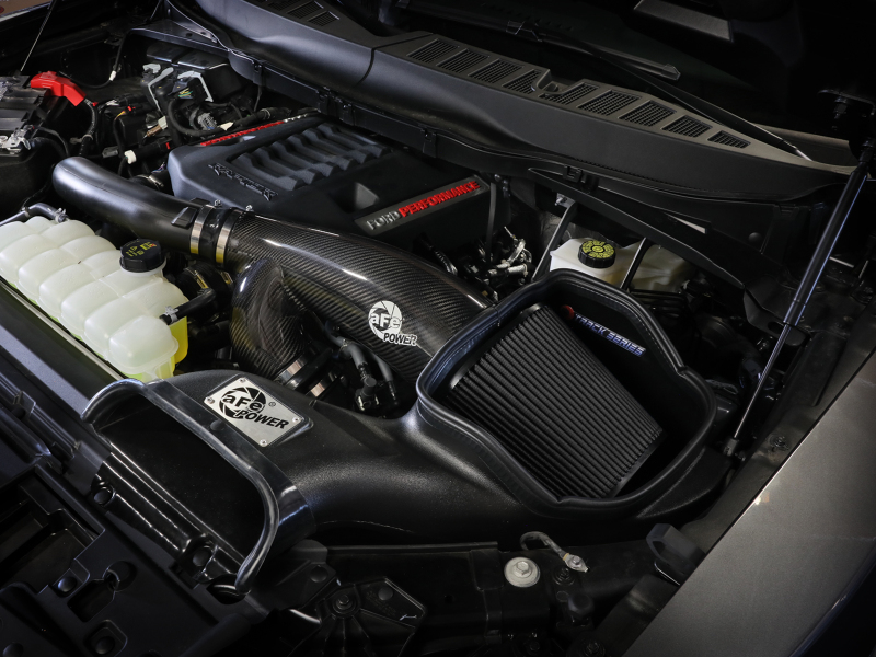Ford F-150 Raptor Performance Air Intake - aFe Track Series Carbon Fiber with Pro 5R Filter (Black) 2021-2025. A direct-fit, open-element intake system that replaces the factory air path with a lightweight carbon-fiber tube and a large Pro 5R filter for improved airflow and a more aggressive induction sound.