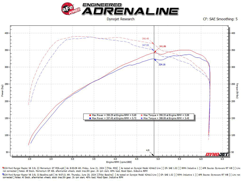This 360-degree radial flow air filter features our oil-free Pro DRY S media with three layers of synthetic media for maximum convenience. Its progressive layering provides great filtration efficiency and dust holding capacity, while not requiring the use of oils. This media is best suited for street and light off-road use. Its inverted top makes for more filter surface area, resulting in longer service intervals. The smooth one-piece sealed housing, constructed of heat-resistant cross-linked polyethylene (XLPE), features our patented pending filter-to-housing interface. Its innovative design minimizes the total number of parts, making for an easy installation. A large, clear sight window allows for hassle-free filter inspection, without having to disassemble your system. The housing incorporates the factory air inlet scoop. This system features high quality, computer-designed, dyno-tuned intake tubes to achieve maximum power gains while maintaining a perfect fit. Its XLPE material is heat soak resistant and extremely durable. Stainless-steel clamps are included for strength, and premium silicone couplings allows for ample flexibility. Momentum GT intakes are designed with fewer parts for a fast and easy installation.. Momentum GT Cold Air Intake System w/ Pro DRY S Filter Ford Ranger Raptor 24-25 V6-3.0L (tt). aFe 2024 Ford Ranger Raptor V6-3.0L Momentum GT Cold Air Intake System w/ Pro DRY S Filter. Clear Sight Window for Convenient Filter Inspection Without Disassembly. Utilizes Factory Mounting Locations for an Easy and Secure Installation. Washable and Reusable Pro DRY S Air Filter for Maximum Convenience. Innovative Filter-to-Housing Interface for Easy Installation. Premium Clamps and Silicone Couplings Provide a Secure Seal. Momentum GT Cold Air Intake System w/ Pro DRY S Filter. Momentum GT Cold Air Intake System. Momentum GT Intake