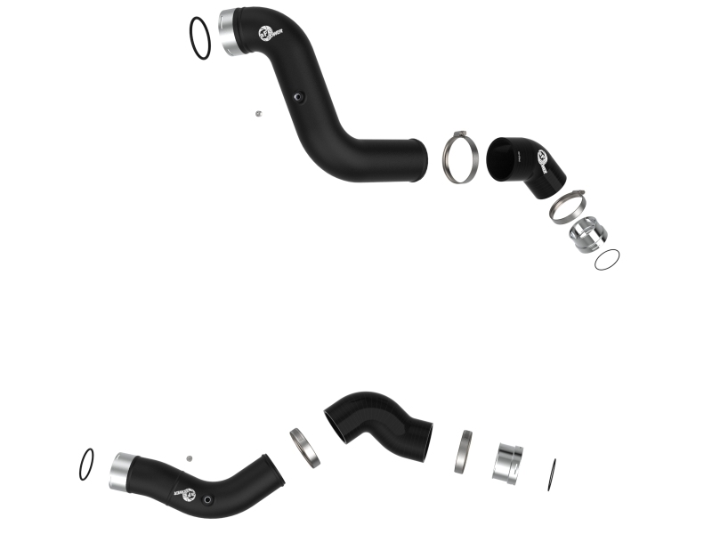 Built from mandrel-bent, TIG-welded aluminum, the aFe BladeRunner kit reduces turbulence and pressure loss between the turbo and engine. Finished in wrinkle black powder coat with a laser-etched aFe POWER logo, the kit resists heat and corrosion while maintaining a factory-style look. It includes stainless-steel SmartSeal clamps, heavy-duty 5-ply polyester reinforced silicone couplings, and factory-style billet aluminum quick-connect adapters with O-ring seals for a secure, leak-resistant fit. 1/8" NPT ports are provided for sensors or water-methanol injection options.