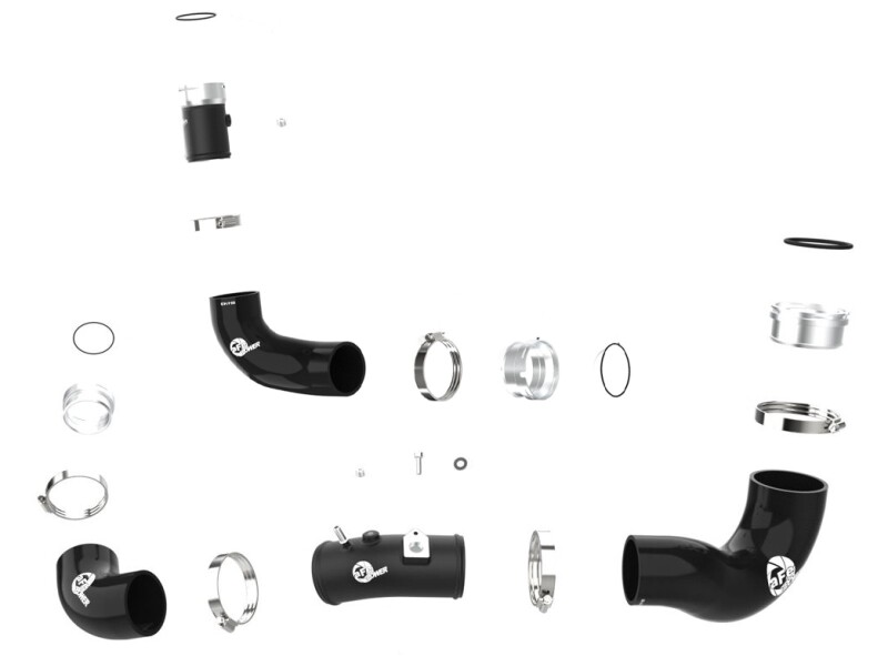 The BladeRunner charge pipe kit is engineered to reduce turbulence and minimize pressure loss with smooth transitions between the turbo and intake. TIG-welded 2-1/2" hot-side and 2-3/4" cold-side aluminum pipes provide robust construction while the powder-coated wrinkle black finish helps resist heat and corrosion. Included are factory-style billet aluminum quick-connect adapters with O-ring seals, premium stainless-steel SmartSeal clamps, and heavy-duty 5-ply polyester-reinforced silicone couplings for a secure, leak-resistant installation. 1/8" NPT ports are provided for sensors or water-methanol injection integration.