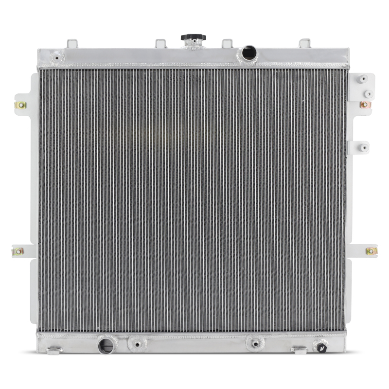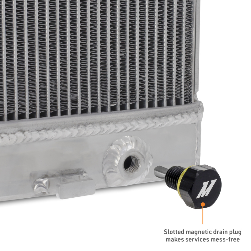 This Mishimoto radiator is constructed from TIG-welded aluminum with reinforced aluminum side brackets to resist cracking and leaks common to stock plastic end tanks. The core delivers a significant increase in coolant capacity and internal flow area to reduce operating temperatures under load. An oversized 7-row in-tank automatic transmission cooler helps keep trans temps in check when towing or off-road, while a magnetic drain plug captures debris. The included 1.3 bar high-pressure radiator cap raises coolant boiling point for more stable performance. Backed by the Mishimoto Lifetime Warranty, this radiator is built for long-term durability and serviceability.
