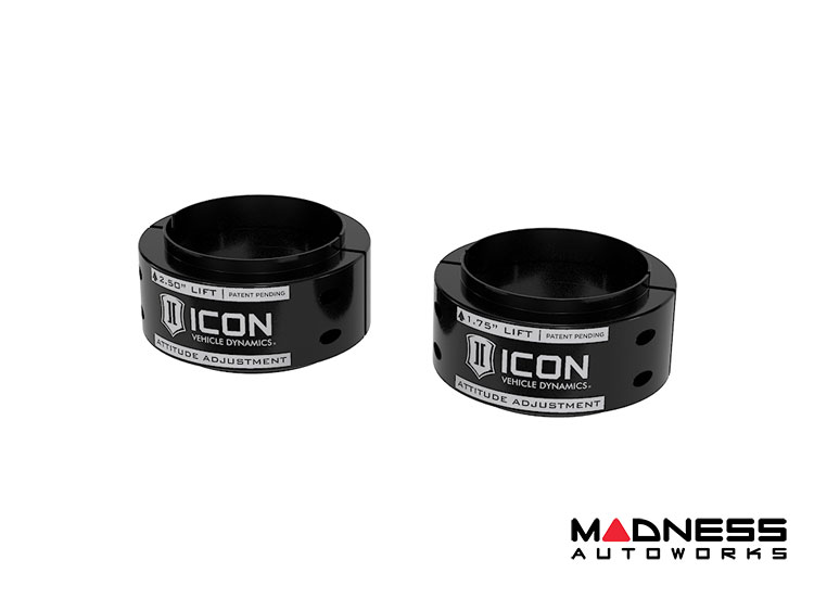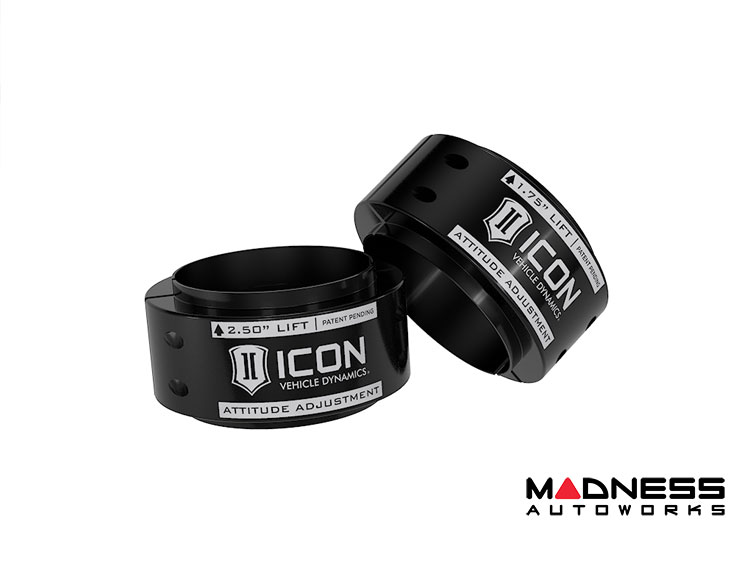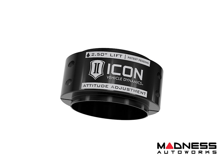 The ICON Attitude Adjustment Collar (AAC) is an industry first, patent pending multi-height coil spring collar that works in conjunction with a top load shim that can be configured in five unique ways to yield .5” to 2.5” of front lift height over stock.