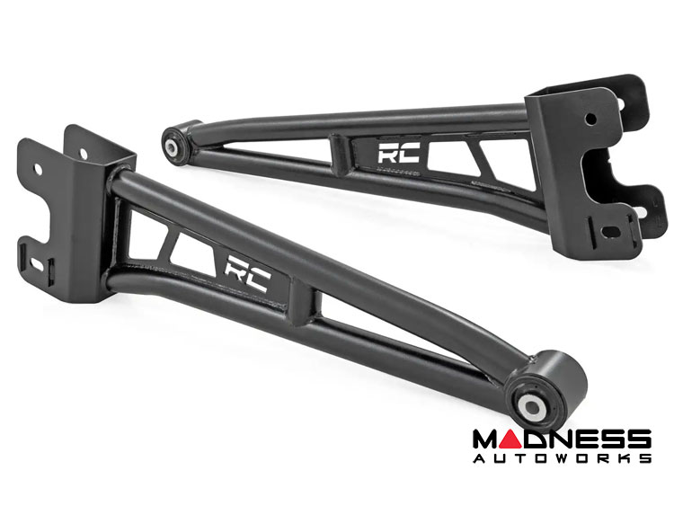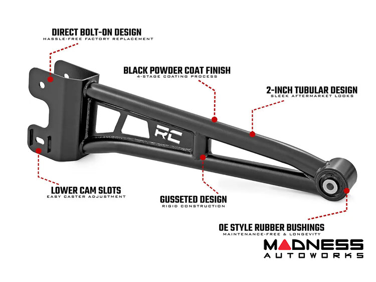 Specifically designed for models with 3” or more lift, this upgrade ensures stable alignment without the need for extra drop brackets. The sleek tubular-style design not only provides a custom look, but also offers massive 2-inch outside diameter and gusseted construction for durability in all conditions. Equipped with OE-Style Rubber Bushings for longevity, this kit ensures maximum vibration absorption for a smooth ride on any terrain. Easily maintain proper alignment with adjustable alignment cam at the axle without any compromises in handling and control.