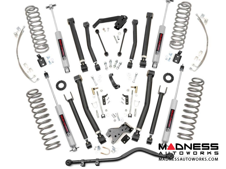This kit comes with a set of front and rear upper and lower adjustable X-Flex Control Arms, lifted coil springs, coil correction plates, an upgraded and adjustable 16-lb. track bar and Rough Country’s premium N3 shock absorbers. The coil correction plates will correct your rear coil spring angle by 10 degrees, which will allow them to function more efficiently.