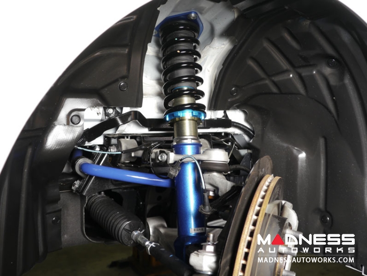 The inverted shock is made from light weight aluminum and features a mono-tube 24-step shock absorber. The specific internal valving is designed both for those who mainly track their vehicles and at times, drive it on the street. The inverted damper prevents external elements from entering the shock casing and retains structural rigidity for added stress loads applied to the coilover.
