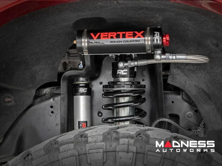 Rough Country’s 6" Coilover Conversion Kit features top-mounted reservoir brackets and coil-over mounts constructed from 1/4-inch steel. Utilizing this conversion kit you're removing the factory independent coil shock and coil set-up and replacing it with a massive 2.5in piston, nitrogen-charged, 8-stage adjustable Vertex Coilover. Rough Country’s Vertex Coilovers feature a monotube design with an external reservoir for increased oil capacity and damping sensitivity. When it comes to investing in a high-end kit, you’ll be pleased to find that Rough Country’s 2.5in piston design is beefier and offers an impressive 56% greater fluid capacity than the average reservoir shock. Each kit is paired with a monotube shock that provides optimal damping control.