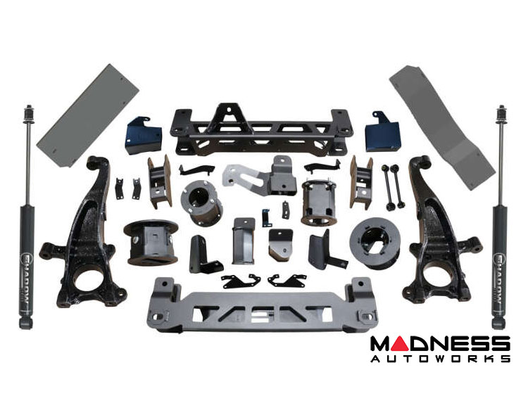Another unique feature are the adjustable rear coil spring spacers. The adjustable spacers guarantee a level stance that a fix height spacer does not offer. Diff drops, brake lines relocation brackets, sway bar correction, rear shocks, and all other required parts are included to make sure your Toyota Tundra handles and performs just like a stock truck!