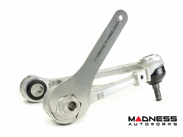 The Powerflex bushings are crafted from a Black 95A durometer polyurethane, which provides not only a firmer support than OE rubber but also a significant increase in responsiveness. The custom CNC-machined stainless-steel adjusting sleeve features an offset bore, granting you the ability to fine-tune your camber settings directly on the car. This versatile design is ideal for those looking to optimize their suspension setup with precision.