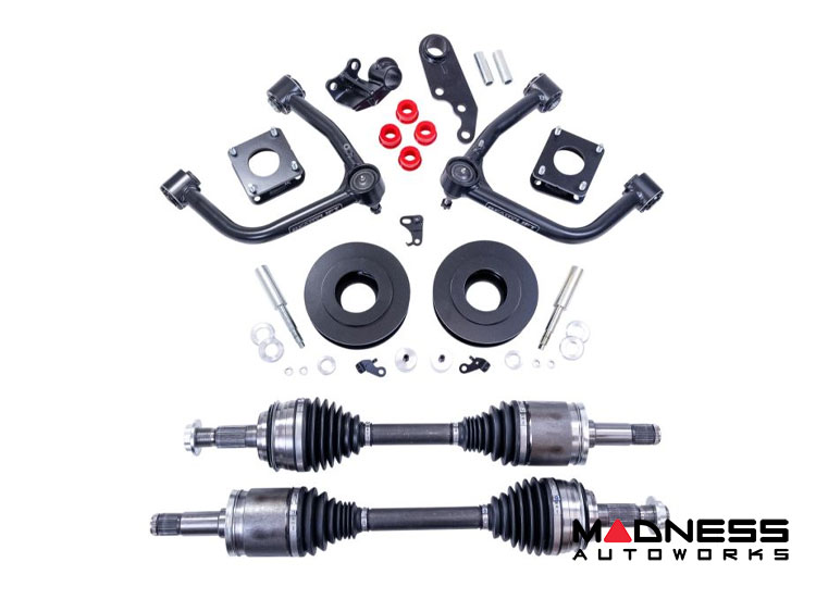 Designed as a premium, bolt-on lift system, this 3" SST Kit offers increased ground clearance and the capacity for larger tires while maintaining the factory ride quality that Tundra drivers expect. It includes a specially designed CV Axle Kit upgrade, built to handle the rigorous demands of extreme 4WD conditions. With these high-angle CV axles, you can enjoy maximum travel and reduced vibration, ensuring your Tundra is ready for any challenge, from rugged trails to weekend outings.