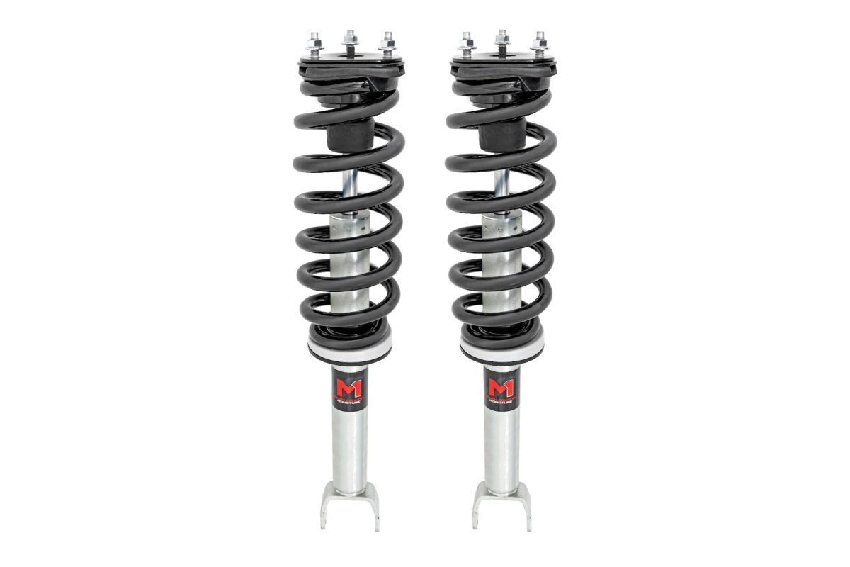 The M1 Loaded Strut Kit from Rough Country is engineered to improve your vehicle's handling, offering smooth performance on both road and rough terrains. The kit is outfitted with M1 monotube struts that feature a 46mm digressive piston, ensuring a stable ride by instantly reacting to varying surface conditions. Whether you're navigating a twisty road or tackling uneven trails, this suspension kit helps maintain control during acceleration, braking, and cornering by restraining suspension overextension.