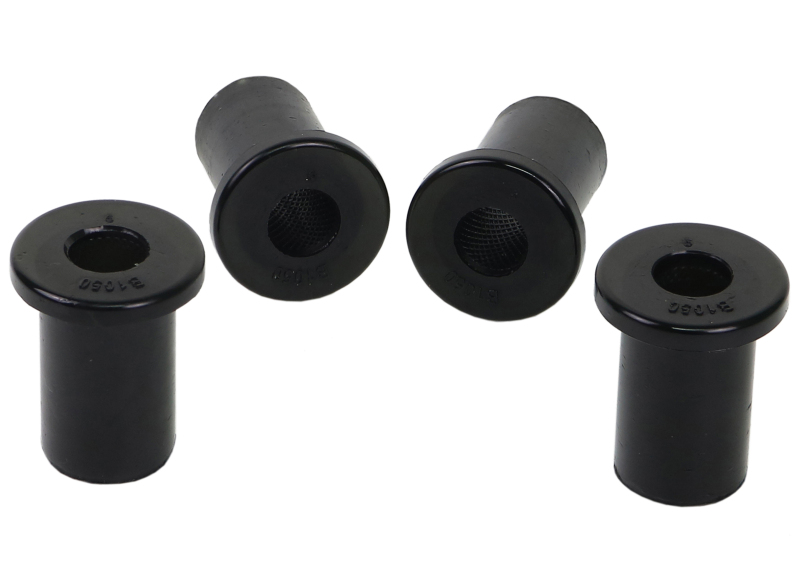 A critical service item for any leaf sprung vehicle. High kilometres and heavy load carrying causes excessive wear on rubber bushings. Whiteline's signature black bushings are made tough and offer outstanding abrasion resistance, high load bearing capability (4WD's, utes and towing), flexibility, increased tensile strength and chemical resistance to oil, grease, ozone and weathering.. Whiteline's latest technology synthetic elastomer formulation boasts resistance to oil, grease, ozone and weathering.. Designed with the installer in mind by reducing the need of specialised skills, tools and equipment.. Internal grease reservoirs provide continual self lubrication for optimum friction management.. Supplied with extreme pressure molybdenum disulphide (LM) based grease for extended life.. Whiteline Plus 83-01 Mitsubishi Montero Rear Shackle Bushing Kit. Leaf Spring and Shackle Bushing Kit. Whiteline Spring - shackle bushing.. Whiteline Spring - shackle bushing. Leaf Spring - Shackle Bushing Kit. Spring - shackle bushing. Bushing Kit