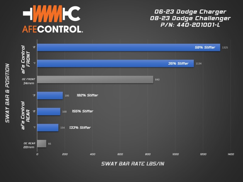 Dramatically improve your Mopar’s handling with aFe CONTROL’s sway bar set. With our fully adjustable sway bars, you can easily fine tune the handling balance and eliminate understeer. Body roll will be reduced, maximizing tire contact with the road. Shortened transition response will improve initial turn-in making the car more agile and feel lighter. Whether its stability on the track, more rotation on the autocross, or just adding confidence in the canyon, aFe CONTROL sway bars will deliver. Every aFe CONTROL sway bar is CAD designed and CNC bent to strict tolerances. This insures precise fit and perfect operation. Our sway bars are 2-way/3-way adjustable, which allows the driver to dial in the front and rear roll resistance to achieve the desired handling bias. Front sway bar utilizes CNC machined ends, while the rear is equipped with laser cut ends. These are welded to the bar in a special fixture to insure accurate hole positioning and consistent manufacturing. aFe Control includes low-deflection polyurethane bushings and premium 6061-T6 aluminum black anodized billet brackets. Front polyurethane bushings are designed to fit with the factory mounting hardware. Rear brackets are equipped with grease fittings for easy maintenance.. Ø25.4mm (1”) Rear Sway Bar, 3-Way Adj. 154 lbs/in (133% Stiffer than Stock) 168 lbs/in (155% Stiffer than Stock) 186 lbs/in (182% Stiffer than Stock). Ø38mm (1.5”) Front Sway Bar, 2-Way Adj. 1134 lbs/in (35% Stiffer than Stock) 1325 lbs/in (58% Stiffer than Stock). aFe CONTROL Front and Rear Sway Bar Set Blue Dodge Charger/Challenger 06-23. Direct Fit Installation Requires No Modifications. 6061 T6 Aluminum Heavy Duty R. Bushing Brackets. aFe 06-23 Dodge Charger Control Sway Bar Set. aFe CONTROL Front and Rear Sway Bar Set Blue. 90A Durometer Polyurethane Bushings. aFe CONTROL Sway Bar Set Blue. CNC Bent, Tubular Sway Bars. Durable Blue Powder Coat. Sway Bar Set