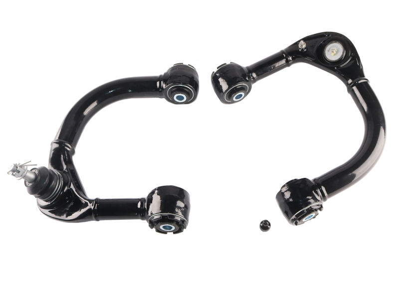 A short fall of the modern day IFS 4wd is the adjustment range provided for successful wheel alignments, this becomes even more of an issue when the vehicle is lifted by more than 1 inch. Not only does the vehicle run into camber and caster issues, but ball joint articulation and clearance issues to the coil over strut at ride and droop height. The new Whiteline offset UCA (Upper Control Arm) is an all-in-one solution for any vehicle that has been lifted between 30mm and 70mm. Providing an increase between +2.5 and +3.5 degrees of caster and up to 1.5 degrees of negative camber increase (figures quoted are based off an approximate 50mm/ 2 inch) along with greater clearance to the coil over strut and more articulation of the arm by virtue of new maintenance free GIIRO bushing technology.. A short fall of the modern day IFS 4wd is the adjustment range provided for successful wheel alignments, this becomes even more of an issue when the vehicle is lifted by more than 1 inch. Not only does the vehicle run into camber and caster issues, but ball joint articulation and clearance issues to the coil over strut at ride and droop height. The new Whiteline offset UCA (Upper Control Arm) is an all-in-one solution for any vehicle that has been lifted between 30mm and 70mm. Providing an increase between +2.5 and +3.5 degrees of caster and up to 1.5 degrees of negative camber increase (figures quoted are based off an approximate 50mm/ 2 inch) along with greater clearance to the coil over strut and more articulation of the arm by virtue of new maintenance free GIIRO bushing technology.. Upper Control Arms designed to add 2.5 to 3.5 degrees of additional positive caster and up to 1.5 degrees of extra negative camber at 2 inches of suspension lift - enhancing alignment geometry, handling stability, and tire clearance.. Protective powder coating acts as a hard skin that is much tougher than conventional paint allowing this product to withstand the toughest conditions and resist corrosion for years to come.. Engineered to alter/ optimise caster alignment to maximize tyre contact patch during roll, improve turn-in response & increase directional stability.. Provides a window of adjustment to rectify or optimise a vehicles wheel alignment.. Control Arm Adds 2.5 To 3.5 Degrees Caster, Up To 1.5 Degrees Camber At 2" Lift. Whiteline 05-22 Toyota Tacoma Control Arms - Front Upper. Whiteline Adjustable Front Upper Control Arm. Alignment Caster / Camber Control Arm. Control arm - upper arm. Whiteline Control Arms. Control Arms