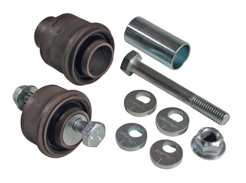 These rear control arm bushings provide an additional +/- 1.25deg of camber and toe adjustment for the rear of the BMW 5 series. Replace the inboard bushings on the rear upper control arms with these innovative adjustable bushings for lifetime adjustability. Use standard bushing press sleeves and bushing press tool 72509 to remove the old bushings and press in the new ones. California Residents WARNING. These rear control arm bushings provide an additional +/- 1.25 of camber and toe adjustment for the rear of the BMW 5 series. Replace the inboard bushings on the rear upper control arms with these innovative adjustable bushings for lifetime adjustability. Use standard bushing press sleeves and bushing press tool 72509 to remove the old bushings and press in the new ones.. Product appearance and features may vary in the market as design changes, improvements and modifications are implemented.. SPC Performance 97-03 BMW E39 Rear Upper Control Arm Bushing Kit. Rubber bonded bushings maintain OE ride quality. Knurled bushing housings ensure a snug fit. Adjusts camber plus or minus 1.25 degrees. Alignment Camber Toe Bushing Kit. SPC 72185 5 SERIES REAR BUSHINGS. Includes mounting cam hardware. Requires one kit per wheel. 5 SERIES REAR BUSHINGS. CAMBER BUSHINGS. ALIGN BUSHNG