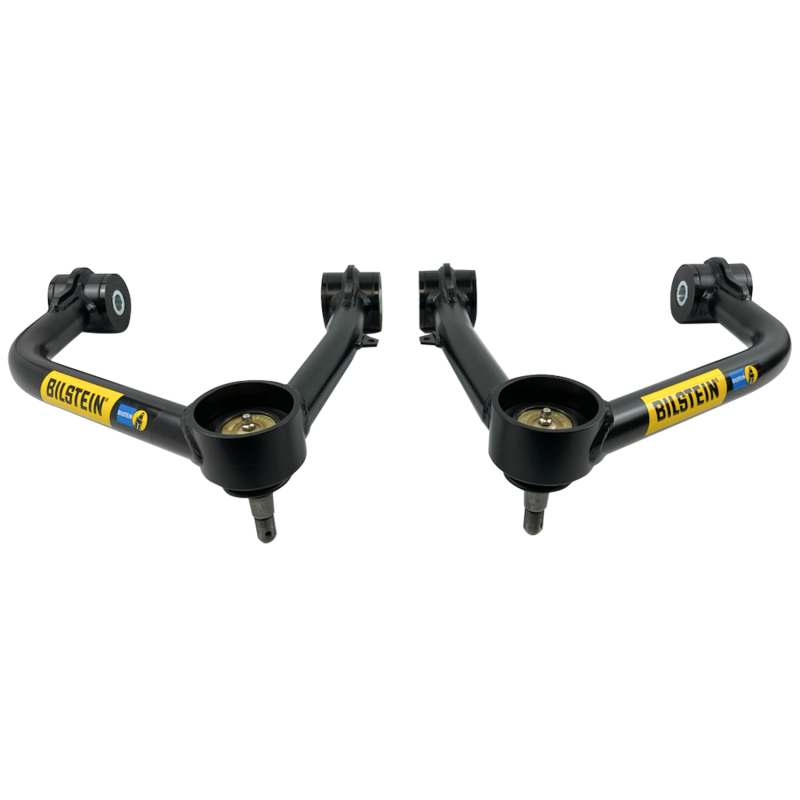 B8 Control Arms are a direct fit upgrade for factory upper control arms on trucks and SUVs. The kit contains a pair of control arms which correct the caster alignment for better straight line stability with lifted suspensions, and the improved pivot angles increase wheel travel and reduce stress on the joints. These strong black powder-coated 4130 chromoly steel arms are a tubular design which allows for more spring and shock clearance and feature greasable polyurethane bushings and heavy duty ball joints for the ideal combination of ride quality and durability with minimal maintenance needed. They come with detailed instructions and all necessary hardware for easy installation and are compatible with all Bilstein shocks and coilover kits. All components are replaceable.. The kit contains a pair of control arms which correct the caster alignment for better straight line stability with lifted suspensions, and the improved pivot angles increase wheel travel and reduce stress on the joints. Strong black powder-coated 4130 chromoly steel arms are a tubular design which allows for more spring and shock clearance and feature greasable polyurethane bushings and heavy duty ball joints. B8 Control Arms are a direct fit upgrade for factory upper control arms on trucks and SUVs. Bilstein 08-21 Sequoia / 07-21 Tundra B8 Front Upper Control Arm Kit. Tubular Ball Joint Upper Control Arm Kit. B8 Control Arms - Upper Control Arm Kit. Suspension Control Arm Kit. Toyota Tundra '07-21; UCA. Control Arm Kit