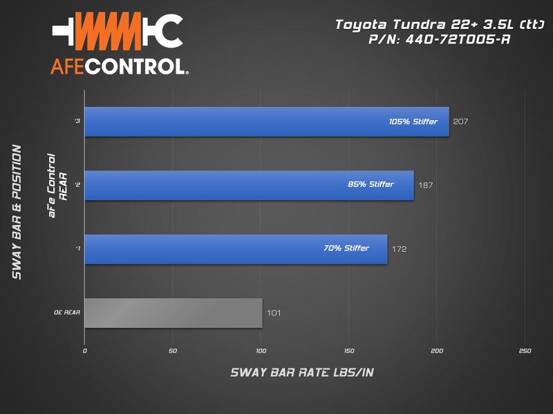 Dramatically reduce body roll without sacrificing ride quality with the aFe CONTROL Tundra rear sway bar. Our 3-way adjustable sway bar will allow you to easily dial in the handling balance of your Tundra. Sharpened steering response will improve initial turn-in making your Tundra feel lighter and more agile. The added stability and control are also welcome when hauling heavy loads in your truck bed or towing. Whether you’re on a road trip with the family or canyon carving in the mountains, aFe CONTROL will get you there. Every aFe CONTROL sway bar is CAD designed and CNC bent to strict tolerances. This insures precise fit and perfect operation.Our rear sway bar is 3-way adjustable. This allows the driver to dial in the rear roll resistance to achieve the desired handling bias. The rear sway bar utilizes laser cut end plates. These are robotically welded to the bar in a dedicated fixture to insure accurate hole positioning and consistent manufacturing. aFe CONTROL includes low-deflection polyurethane bushings and premium 6061-T6 aluminum black anodized billet brackets which are equipped with grease fittings for easy maintenance.. 172 lbs/in (70% Stiffer than Stock)     187 lbs/in (85% Stiffer than Stock)     207 lbs/in (105% Stiffer than Stock). aFe Control 22-24 Toyota Tundra V6-3.5L (tt) Rear Sway Bar - Red. aFe CONTROL Rear Sway Bar Toyota Tundra 22-25 V6-3.4L (tt). Direct Fit Installation Requires No Modifications. Ø32mm (1.25”) Rear Sway Bar, 3-Way Adjustment. 6061-T6 Billet Aluminum Bushing Brackets. 90A Durometer Polyurethane Bushings. CNC Bent, Solid Steel Sway Bar. aFe CONTROL Rear Sway Bar. Durable Red Powder Coat. Proudly Made in the USA. Rear Sway Bar