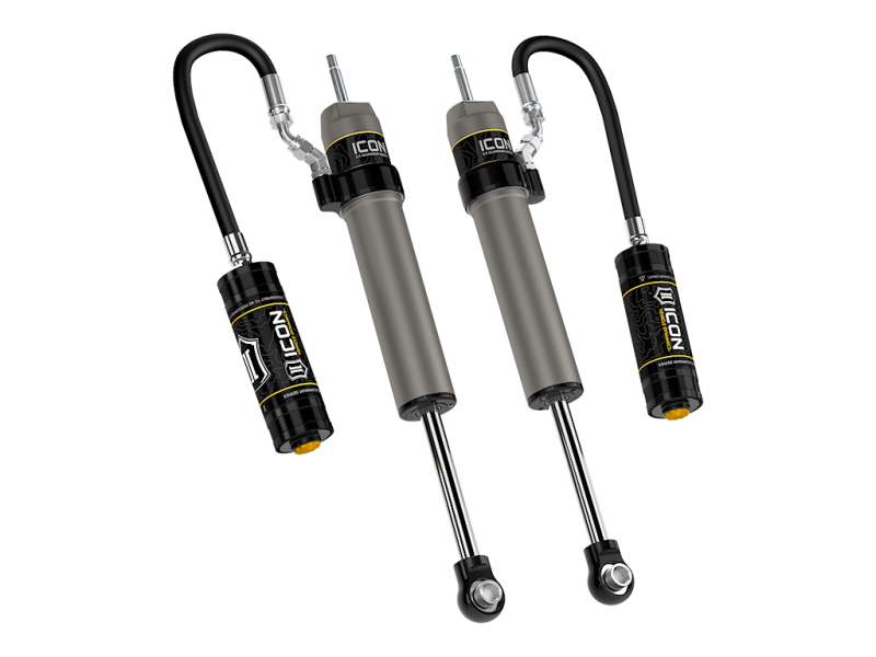 ICON Vehicle Specific (V.S.) 2.5 Aluminum Series shocks are designed and built to give your vehicle outstanding performance off-road and a smooth ride on the street. These shocks are configured specifically for each application in both length and damping tune. Like all ICON'S Shock Absorbers, V.S. 2.5 Aluminum Series shocks are 100% rebuildable and 100% revalveable. For piggyback and specific remote reservoir applications, ICON'S unique use of a 6061 billet aluminum manifold a few inches below the top cap of the shock creates an internal Bump Zone that when used creates an additional 20% of damping force. This additional force helps prevent harsh bottom outs and controls the suspension when compressing at high velocity. If you are looking for a more user defined tune, consider looking into the Compression Damping Control Valve (CDCV) shocks.. ICON VS 2.5 Aluminum Series shocks are designed and built to give your vehicle outstanding performance off-road and a smooth ride on the street. They feature remote reservoirs and are 100% rebuildable/revalveable.. All ICON 2.5 Series Piggyback and Remote Reservoir shocks can be upgraded to ICON’s Compression Damping Control Valve (CDCV). One piece digressive piston design with vehicle specific valving for unsurpassed performance and ride quality on and off-road. ICON’s internal “Bump Zone” increases damping by 20% to provide more control as the shock approaches full compression. One-piece impact extruded aluminum cylinders offer excellent corrosion resistance and consistent finish. TECH NOTE: Compatible with Land Cruiser 300 Series equipped with 0-2" of rear lift over stock. Premium grade 5WT shock oil for consistent suspension damping along a wide temperature range. Remote reservoir design improves heat dissipation to reduce shock fade during prolonged use. ICON 22-23 Toyota Land Cruiser 300 0-2in Rear 2.5 Series Shocks VS RR - Pair. PTFE lined spherical bearings and application specific mounting hardware. 7/8” diameter induction hardened, chrome plated shock shaft. Nitrogen charged monotube design with remote reservoir. 6061 aircraft grade aluminum CNC machined components. 22-23 LC 300 0-2" REAR 2.5 VS RR PAIR. Suspension Shock Absorber Set. SHOCK ABSORBER PAIR. 100% Rebuildable. 100% Revalveable. 57827P