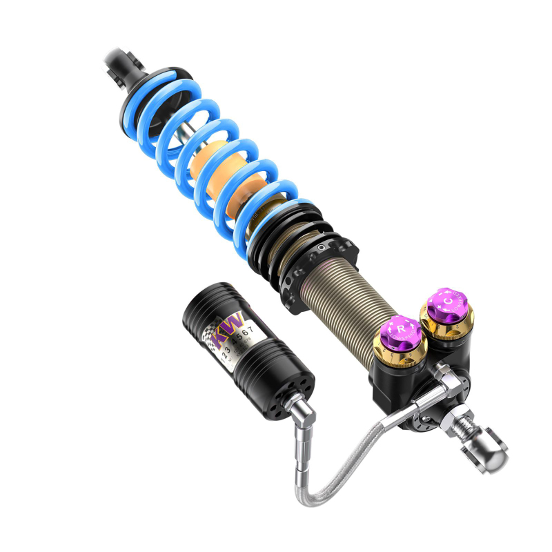 By launching the new KW V5 coilover suspension, KW focuses on its successful motorsport suspension technology with KW Solid Piston Technology and modular design with damper valves connected in series. The KW V5 assures precise and fast damping without delay in sports cars and super sports cars. The shock absorbers and valves react directly, even with small spring travel, minimal steering movements, and minor road undulations. Every driving maneuver and every input, such as those generated during braking, acceleration, steering, load changes, and undulations, are damped much more precisely. The KW Solid Piston dampers provide much more platform support to the chassis than conventional dampers and thus, depending on the vehicle body allow for lower spring rates to be used. The KW V5 with adjustable KW SPCLH-A (KW Solid Piston Compression Low- and Highspeed Adjustable) compression damping and the KW SPRLH-A (KW Solid Piston Rebound Low- and Highspeed Adjustable) rebound damping offers significant added values: more sensitive damping, cavitation-free function, precise high-frequency damping, low-pressure gas range from 6 to 10 bar and low hysteresis. The low- and high-speed valve units in the KW V5 coilover suspension, which are built-in series with different valve spring types and main valves, offer the freedom to individually adjust the compression and rebound damping with 13 exact clicks (14 characteristic curves) each in the low- and high-speed range. The KW Solid Piston Technology can also be used to cover a large force range when designing the chara cteristic curves; all the more reason to enable a completely new type of harmonious damping. The KW V5 allows a maximum or individual lowering within the tested adjustment range. Due to the dirt-resistant trapezoidal thread and the polyamide threaded ring, the continuous lowering can be varied quickly and easily, even after the years.. By launching the new KW V5 coilover suspension, KW focuses on its successful motorsport suspension technology with KW Solid Piston Technology and modular design with damper valves connected in series. The KW V5 assures precise and fast damping without delay in sports cars and super sports cars. The shock absorbers and valves react directly, even with small spring travel, minimal steering movements, and minor road undulations. Every driving maneuver and every input, such as those generated during braking, acceleration, steering, load changes, and undulations, are damped much more precisely. The KW Solid Piston dampers provide much more platform support to the chassis than conventional dampers and thus, depending on the vehicle body allow for lower spring rates to be used. The KW V5 with adjustable KW SPCLH-A (KW Solid Piston Compression Low- and Highspeed Adjustable) compression damping and the KW SPRLH-A (KW Solid Piston Rebound Low- and Highspeed Adjustable) rebound damping offers significant added values: more sensitive damping, cavitation-free function, precise high-frequency damping, low-pressure gas range from 6 to 10 bar and low hysteresis. The low- and high-speed valve units in the KW V5 coilover suspension, which are built-in series with different valve spring types and main valves, offer the freedom to individually adjust the compression and rebound damping with 13 exact clicks (14 characteristic curves) each in the low- and high-speed range. The KW Solid Piston Technology can also be used to cover a large force range when designing the characteristic curves; all the more reason to enable a completely new type of harmonious damping. The KW V5 allows a maximum or individual lowering within the tested adjustment range. Due to the dirt-resistant trapezoidal thread and the polyamide threaded ring, the continuous lowering can be varied quickly and easily, even after the years.. For over 20 years, KW automotive has been the market leader and driving innovation as a manufacturer of individual suspension solutions for the road and in all types of motorsports. No matter where in the world, gearheads, automobile manufacturers and reputable tuners rely on our KW coilovers "Made in Germany". Every KW coilover kit undergoes extensive stress testing before production and is developed and manufactured exclusively in our company headquarters in Fichtenberg, a small in town in Germany, to meet the high standards of our KW quality management. For us as a German manufacturer, it goes without saying that our KW coilover kits will exceed the original equipment manufacturer quality and offer useful and innovative solutions. With an application list comprising more than 4,600 options KW guarantees an outstanding selection backed by our Limited Lifetime Warranty.. For over 20 years, KW automotive has been the market leader and driving innovation as a manufacturer of individual suspension solutions for the road and in all types of motorsports. No matter where in the world, gearheads, automobile manufacturers and reputable tuners rely on our KW coilovers "Made in Germany". Every KW coilover kit undergoes extensive stress testing before production and is developed and manufactured exclusively in our company headquarters in Fichtenberg, a small in town in Germany, to meet the high standards of our KW quality management. For us as a German manufacturer, it goes without saying that our KW coilover kits will exceed the original equipment manufacturer quality and offer useful and innovative solutions. With an application list comprising more than 4,600 options KW guarantees an outstanding selection backed by our Limited Lifetime Warranty.. Ultra high performance technology -KW TTSP) bred from GT3 motorsports. KW 4-way independently adjustable damper technology. The KW V5 assures precise and fast damping without delay in sports cars and super sports cars. The shock. Road legal motorsports technology featuring independent rebound and compression adjustability and application specific spring and damper tuning resulting in unparalleled