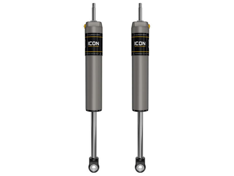 ICON Vehicle Specific (V.S.) 2.5 Aluminum Series shocks are designed and built to give your vehicle outstanding performance off-road and a smooth ride on the street. These shocks are configured specifically for each application in both length and damping tune. Like all ICON'S Shock Absorbers, V.S. 2.5 Aluminum Series shocks are 100% rebuildable and 100% revalveable. The larger diameter and oil volume of ICON 2.5 Internal Reservoir shocks provide improved suspension performance, better ride quality, and heat dissipation properties than the standard 2.0 Aluminum Series Internal Reservoir shocks. If you are looking for a more user defined tune, consider looking into the Compression Damping Control Valve (CDC Valve) shocks.. ICON 2.5 Aluminum Series shocks are designed to give your vehicle outstanding performance off-road and a smooth ride on the street. These shocks are configured specifically for each application in both length and damping tune.. One-piece digressive piston design with vehicle specific valving for unsurpassed performance and ride quality on and off-road. TECH NOTE: Compatible with 3-5" of front lift over stock on 2023-2025 Super Duty models equipped with Tremor package.. TECH NOTE: Compatible with 4-6" of front lift over stock on 2023-2025 Super Duty models without Tremor package.. One-piece impact extruded aluminum cylinders offer excellent corrosion resistance and consistent finish. TECH NOTE: Can be installed as secondary shocks in OE location with ICON 4-6" lift coilover conversions. Premium grade 5WT shock oil for consistent suspension damping along a wide temperature range. Increase in strength and heat dissipation when compared to ICON V.S. 2.0 Series shocks. Polyurethane bushings and forged steel mounting stems for OE factory type fitment. PTFE lined spherical bearings and application specific mounting hardware. TECH NOTE: Optimized length for pairing with ICON 4.5" lift coil springs. 7/8” diameter induction hardened, chrome plated shock shaft. Nitrogen charged monotube design with internal reservoir. 6061 aircraft grade aluminum CNC machined components. APPLICATION NOTE #150: Shocks are fully serviceable. ICON 23-24 FSD 4WD 4.5in Front 2.5 VS IR Pair. APPLICATION NOTE #1: Only fits 4WD models. 23-25 FSD 4.5" FRONT 2.5 VS IR PAIR. Suspension Shock Absorber Set. SHOCK ABSORBER PAIR. 100% Rebuildable. 100% Revalveable. 67611P