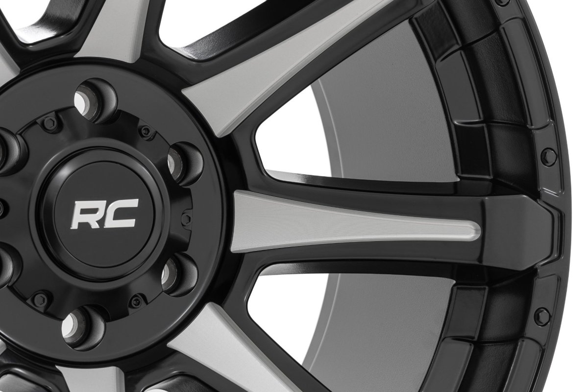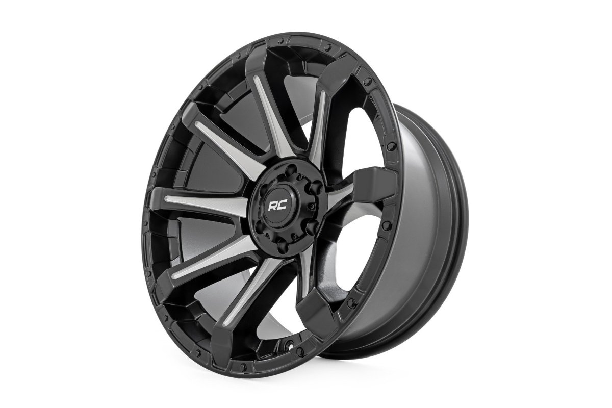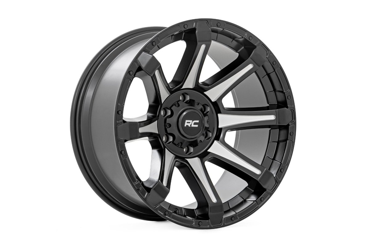 Upgrade your vehicle's performance and style with the Wheel - Rough Country - 81 Series. This 8-spoke wheel, measuring 20x9 with a 5x5.5 bolt pattern and 0mm offset, shines with a semi-gloss black finish complemented by machined spokes. It’s an ideal choice for those seeking a blend of ruggedness and refined design.