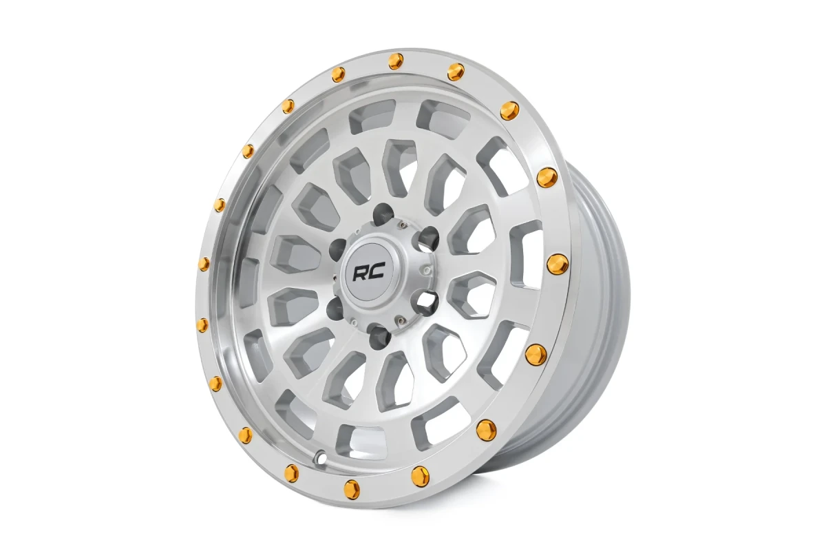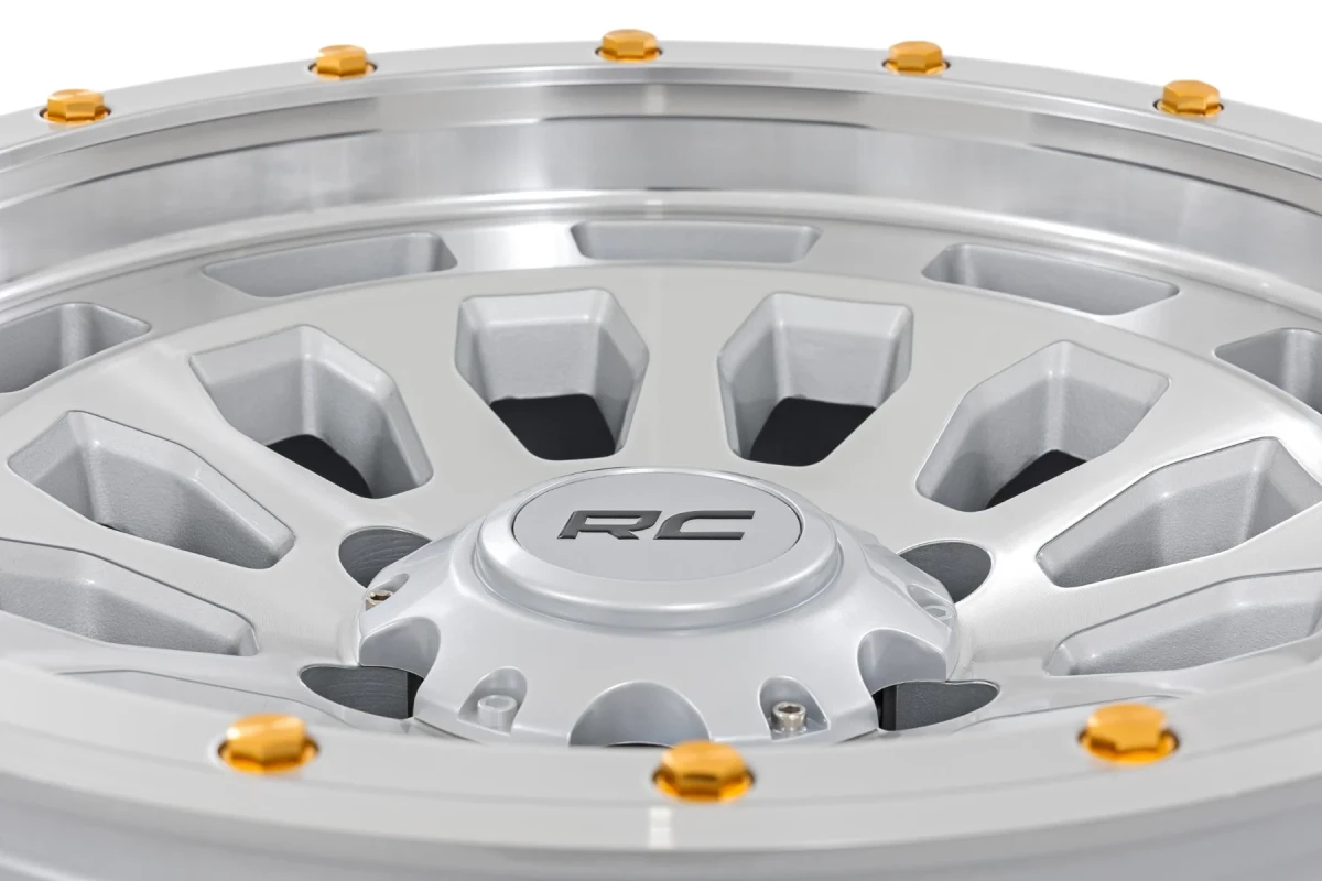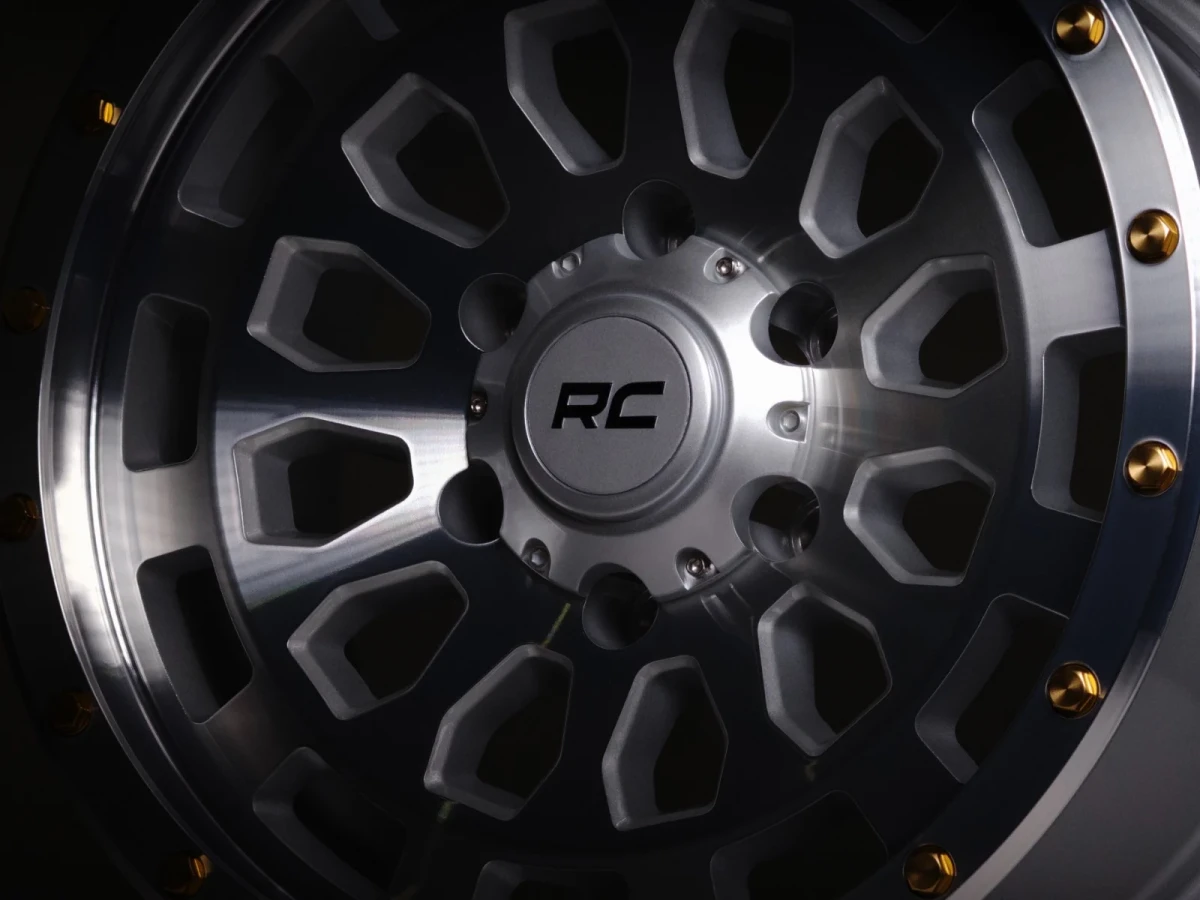 The Custom Wheel 87 Series features a full machined finish with bold gold accents, providing a perfect blend of durability and unmistakable flair. Designed with the adventurous driver in mind, these wheels showcase a simulated beadlock style, lending a touch of off-road charisma to any vehicle. The one-piece aluminum construction ensures strength and lightness, promising lasting durability and excellent performance on the road. Every detail, including a custom RC center cap with striking black RC lettering, adds to the wheel’s distinctive look.