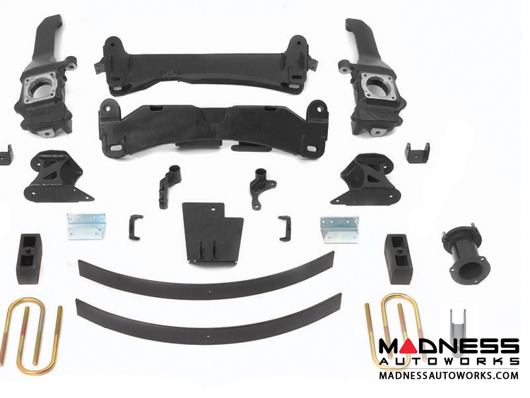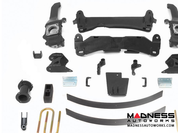 Fabtech's 6" Basic Systems achieves lift by the use of steel coilover shock spacers up front that utilize the stock coilover shocks. This system includes Fabtech's proven IFS technology with longer length ductile iron steering knuckles and arched cross members in order to maintain exceptional suspension ground clearance. This system comes complete with a 1/4" thick differential skid plate, impact struts, heavy duty tie rods, rear add-a-leafs and more.