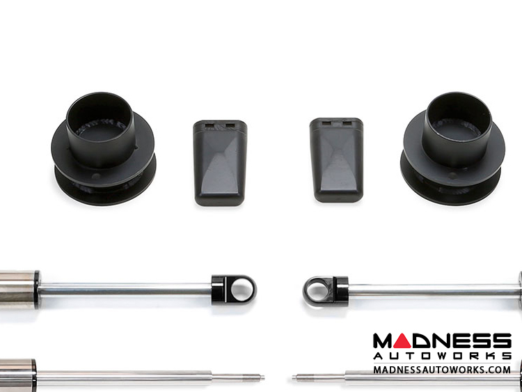 From the factory, Dodge incorporated coil springs with a large bow for increased vehicle stability. Because of this feature, flat spacers won't do you much justice. Fabtech’s angled spacers retain this important feature preserving the factory ride characteristics. Replaced with longer length shocks, you will allow for full suspension travel while improving the damping of the front suspension. Included in this system are extended length bump stops to prevent the coil springs from binding at full compression.