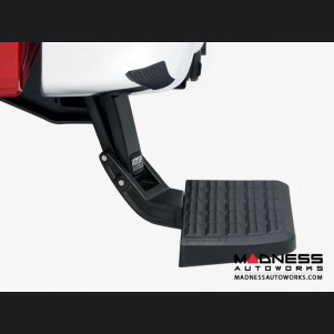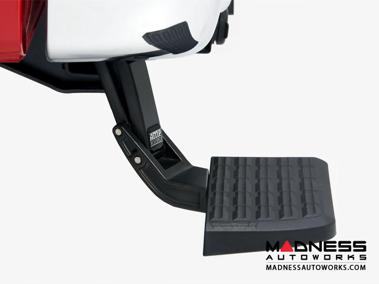 AMP Research BedStep bumper steps step up with American-made quality! These steps retract as easily and quietly as the extend down. Made from high strength aluminum alloys and precision stainless steel pivot pins, they can support up to 300 lbs. They securely mount to your truck frame under the bumper so you can use them with an open tailgate or when towing. They are maintenance-free with self-lubricating bushings and feature a military-spec, corrosion-resistant, anodized and Teflon® coated finish for great all-weather performance. Although Telfon coated, the BedSteps are lined with non-slip composite step pads that are large enough for two large boots!
