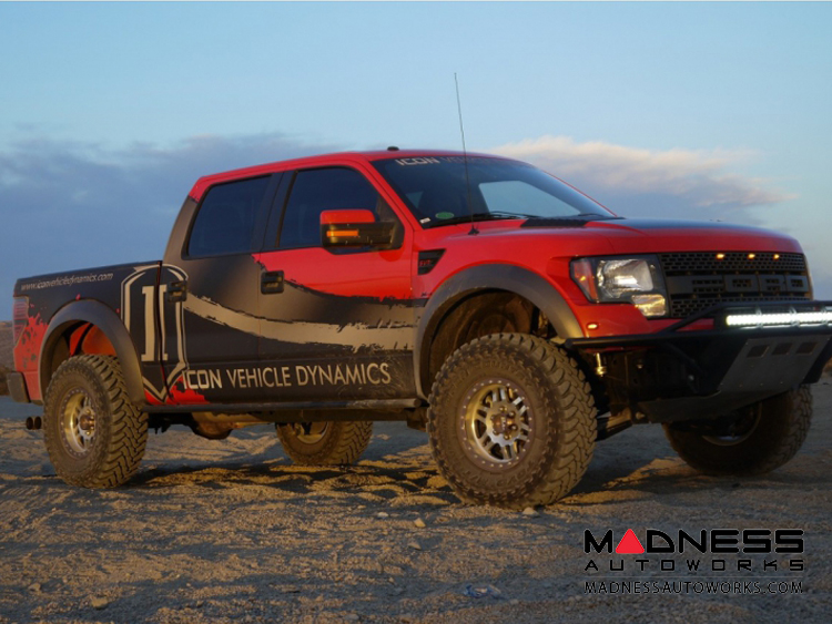 The Rear ZETA Ford SVT Raptor Shocks are a true 3.0” (inside and out), three tube External Bypass shock. These are far from the norm when compared to a traditional bypass shock you see on Trophy Trucks and other off-road race vehicles. Each bypass valve has a specific port design and individually equipped with a different spring rate to ensure proper performance at each zone of shock travel. These same bypass valves feature dampened valve stops for quiet and precise operation. That means no clicking noises as you hit bumps or road chatter driving down the road. The biggest difference in these shocks versus an industry standard bypass shock, are the “Easy-to-Adjust” knobs and the replaceable bypass tubes. The “Easy to Adjust” Hi Resolution Clicker Knobs do not require any tools for adjustment, and can be adjusted in seconds from plush off-road performance to firm on road manners for extra control while driving the mountains or towing a trailer. Another unique feature of this shock is the replaceable bypass tubes that can be swapped out during a standard rebuild if any damage were to occur, where a normal bypass shock body would need to be completely replaced, saving you hundreds of dollars.
