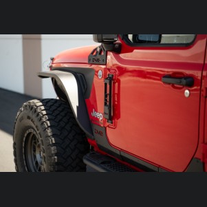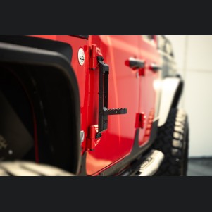 Designed for easy installation, these steps mount effortlessly at two secure points along each door hinge, ensuring they stay firmly in place while in use. Our innovative anti-rattle ball-catch design offers a superior grip, making your climb and descent smooth and stable. And when not in use, the step conveniently folds up and out of the way, maintaining the sleek look of your Jeep.