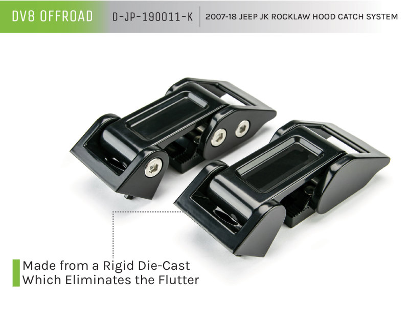 The exhilarating experience of driving your Jeep Wrangler JK should never be overshadowed by hood flutter at high speeds. If you’ve witnessed this unsettling flutter, it’s likely due to worn-out, stock hood latches. Let us introduce you to the DV8 RocKlaw Hood Catch System—a premium upgrade engineered for both functionality and style. Crafted with precision and attention to detail, the RocKlaw Hood Catches ensure a secure, flutter-free ride for your Jeep Wrangler JK.