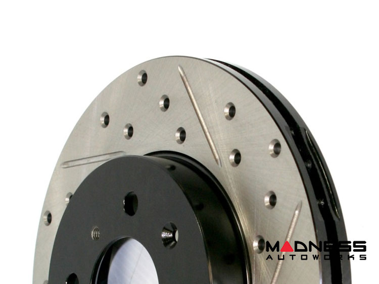 StopTech Drilled and Slotted Sport Rotors are 1-piece direct replacement brake discs for factory brake systems and stock calipers that look great behind your wheels – and offer significantly improved braking performance. The unique cross-drilling and slotting aids with heat and brake dust dispersal, prevents glazing of the pads, adds bite and improves wet and dry braking performance. Built to last, the black e-coating provides protection from corrosion and the high carbon metallurgy (in most applications) offers quieter operation, better crack resistance and increased performance.