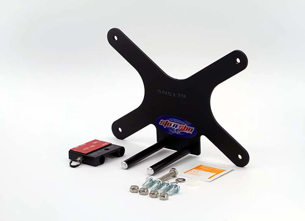 The STO N SHO is a two piece detachable front license plate mounting system consisting of a front license plate holder and a base mounting plate that allows for the easy removal of the front license plate when desired and the quick replacement of the front license plate when needed. When the front license plate holder is removed the remaining base plate is virtually undetectable. The STO N SHO allows you to comply with state law while maintaining the beauty of your F-Type.