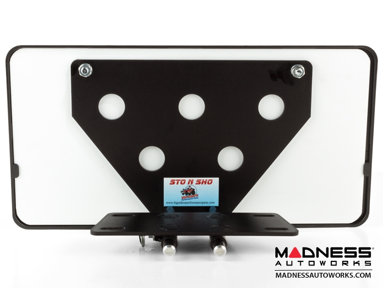 The STO N SHO is a two piece detachable front license plate mounting system consisting of a front license plate holder and a base mounting plate that allows for the easy removal of the front license plate when desired and the quick replacement of the front license plate when needed. When the front license plate holder is removed the remaining base plate is virtually undetectable. The STO N SHO allows you to comply with state law while maintaining the beauty of your Jeep Renegade.