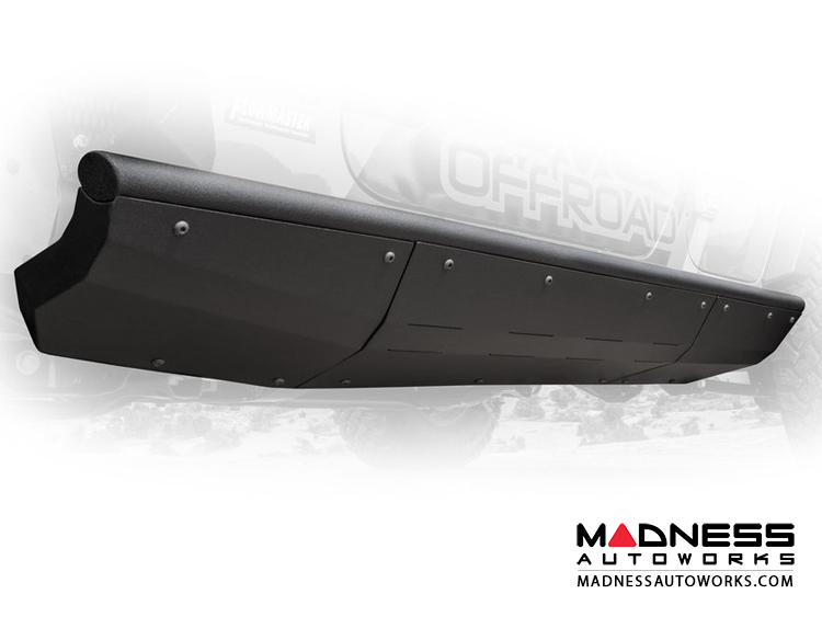 These sliders bolt directly to the frame and utilize the frame to body mounts along with the frame rails themselves to add rigidity and reduce deflection to near zero. They can be run as a regular slider or can be used with the included plates to create a mini boatside effect. These plates help the Jeep to slide off of obstacles rather than getting hung up. Install is simple and 100% bolt on so the sliders can be removed for touch up or recoating.