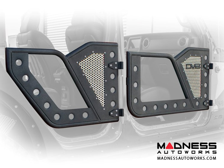 The DV8 Offroad JL Rock Doors provide protection and security while still allowing for an open air door less experience. These rock doors come with a removable and paintable aluminum mesh screen and are made of .160 wall tubing and 3/16" steel plating.