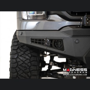 The newly redesigned Addictive Desert Designs HoneyBadger Front Bumper keeps the same rugged styling as the original but with a low-profile fitment. There is an optional top hoop, but either configuration has room to mount a radius 30" light bar on top of the bumper. The center of the bumper houses a straight 20" light bar, and two cube lights can be mounted behind the side panels.