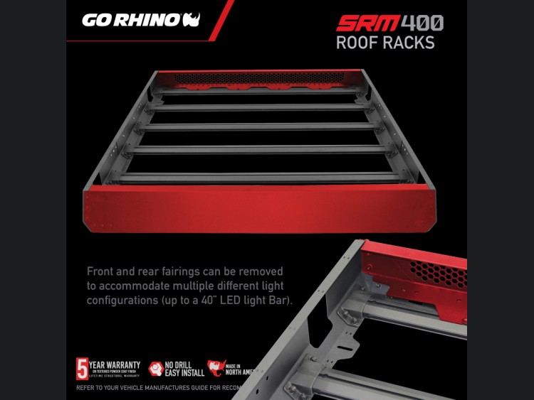 The Jeep Gladiator - GOR SRM Racks are the pinnacle of versatility and durability, designed to accommodate all your adventure and utility needs. Introducing the Go Rhino SRM400 Roof Rack: a basket-style roof rack that transcends ordinary capability with its customizable design. Whether you’re heading into the wild with kayaks, planning a surf trip, or simply need to bring along lumber for your next project, the SRM400 easily adapts to carry oversized items with ease. Its removable front and rear fairings enable user-customization, ensuring a snug fit for various cargos.