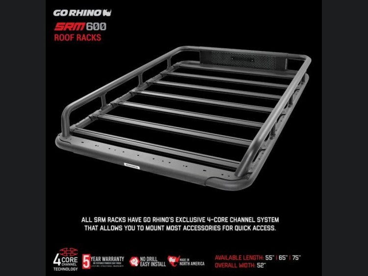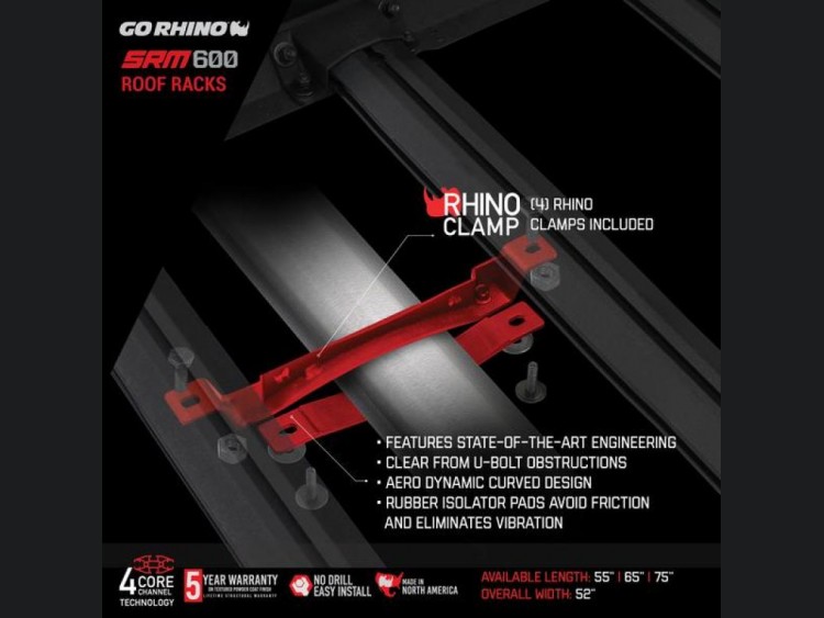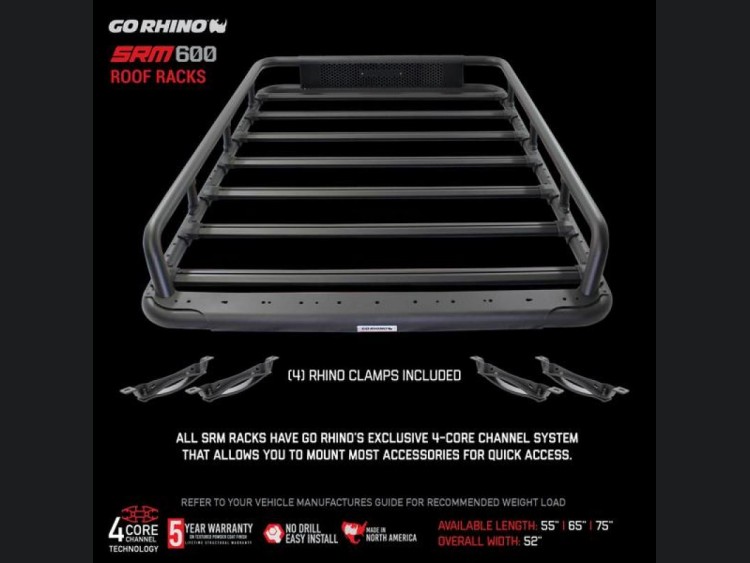 With a generous width of 52 inches and a length of 75 inches, the SRM600 can be mounted on any vehicle’s original equipment (OE) crossbars using the handy Rhino Clamp system included. This easy installation ensures that you spend less time setting up and more time enjoying the open road. Opt for the infinite possibilities of attachments with Go Rhino's exclusive 4-CORE aluminum bars. This innovative extruded track system supports any 1/4x20 hex bolt, offering limitless mounting options for all your trail tools and gear.