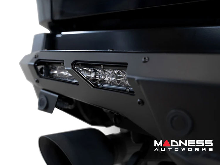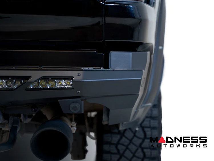 Add even more character with a pair of 10-inch SR LED lights bars installed behind satin black aluminum accent panels on each end. Only with the Phantom Rear Bumper will you get this great blend of form and function in an aftermarket bumper. So if you’re ready for an impactful and eye-catching upgrade on the rear of your truck, look no further than the Phantom. This is fully bolt-on and Made in the USA.