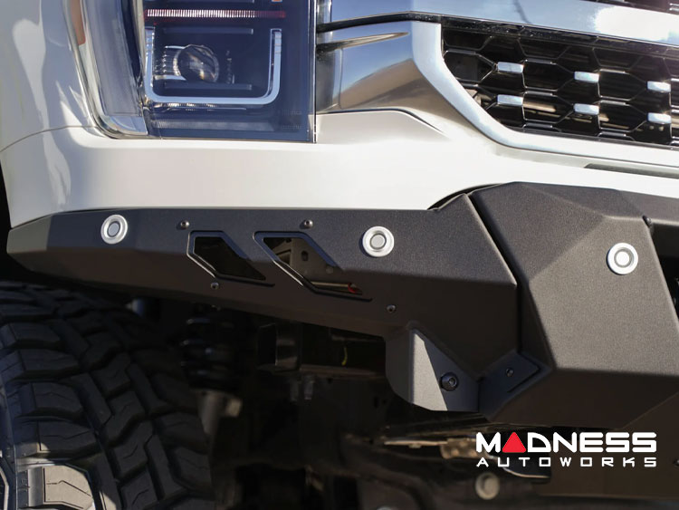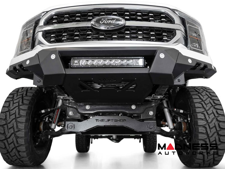 The Black Label Front Bumper is not only functional but also visually appealing. The bumper is finished in a durable hammer black powder coat, while the accent panels feature a sleek satin black finish. This combination adds a touch of style to your Ford F-150.