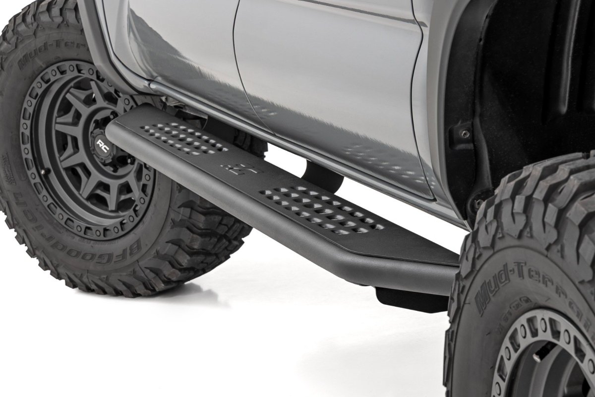 OV2 Running Boards | Side Step Bars | Crew Cab | Toyota Tacoma (2016-2023) Rough Country's OV2 running board is the perfect combination of off-road style and function. These heavy-duty steel steps feature a rugged tubular construction for strength and rocker panel protection while still boasting a large area for secure footing. With rugged construction and easy installation, it's time to elevate your Toyota Tacoma's performance and style.Rugged Durability: Made from durable steel and wrapped with a tubular side wall, the OV2 Running Boards offer reliable protection against rocks and debris the trail throws your way. The 1-3/4 inch steel tubing provides added body protection, ensuring your Tacoma stays in top condition no matter where you go.Ample Stepping Area: With a generous 6-3/4-inch-wide stepping area, these running boards offer plenty of foot room, making it easy to enter and exit your Tacoma, even with mud-caked boots.Corrosion Resistance: Finished with a durable powder coat, our running boards are built to withstand the elements and resist corrosion, so they'll look great for years to come.Easy Installation: Say goodbye to complicated installations. The OV2 Running Boards feature a no-drill installation process, allowing you to equip your Tacoma for off-road adventures without the hassle.Peace of Mind: Rough Country stands behind the OV2 Running Boards with a limited lifetime warranty, so you can trust that our boards are a reliable investment for your Tacoma.Whether you're navigating rocky trails or cruising through mud and sand, these running boards are the ultimate off-road companion, providing a sure step and unmatched protection for your rig.