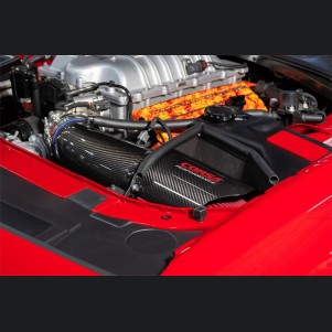 Crafted from 100% carbon fiber, this air intake is optimized to enhance airflow to your engine, effectively boosting performance without sacrificing style. The optimized shape of the air intake duct in combination with advanced high-flow filtration results in noticeable gains in horsepower and torque. Specifically, it can deliver up to an additional 27 horsepower and 23 lbs-ft of torque from the supercharged 6.2L HEMI engine without requiring a tune. Engineered with precision, it's designed to meet the needs of serious car enthusiasts who want improvements in fuel economy and engine response. The robust build ensures durability and resistance to heat soak while providing captivating visual appeal under the hood. Additionally, it's outfitted with a black powder-coated aluminum heat shield to block engine heat, along with a carbon fiber rain guard to protect the filter from water intrusion.