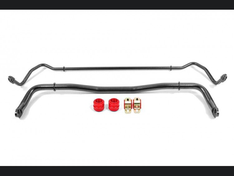 The Dodge Challenger Sway Bar Kit - Front + Rear by BMR Suspension, finished in a sleek Black Hammertone, offers a substantial upgrade to your `08-`20 Dodge Challenger's suspension system. Designed to enhance cornering stability and handling, this sway bar kit provides a driving experience that remains firm and responsive on both casual drives and aggressive maneuvers.